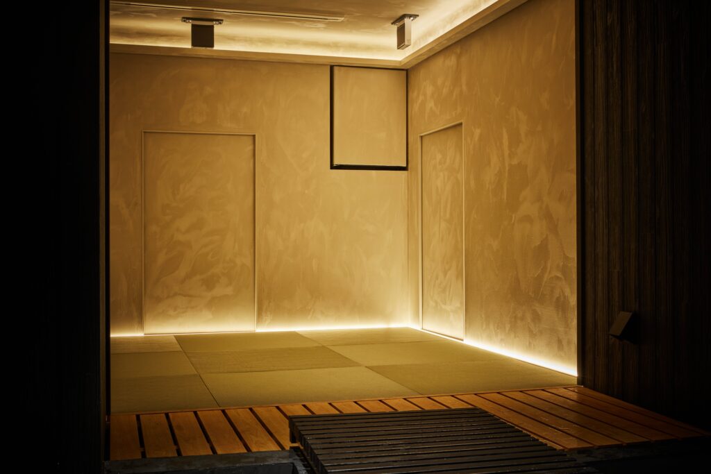 私は、父と同じく建築の道に進み、多くのヨーロッパの建築学生がそうであるようにミニマルな日本の建築に共感し、自分の出自も相まって日本の建築文化を勉強してきた、今回のプライベートサウナのプロジェクトにおいては当初のアイデアから茶室を取り入れられないかを検討し、同世代の茶人のアドバイスを受けながら作り込んでいった、内装のプランにおいてはサウナ室と、茶室を行ったり来たりするにあたり水風呂に橋がかかっているような空間構成を提案した。